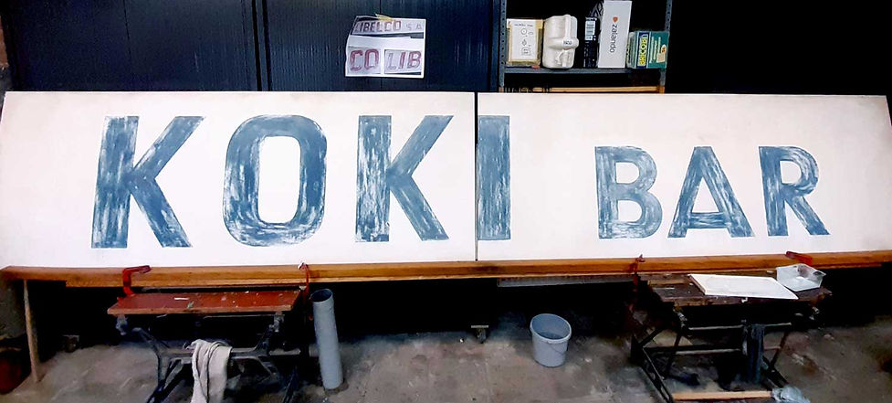 La demande était ici de reproduire une enseigne qui existait sur le lieu de tournage, mais en changeant le texte et la couleur.